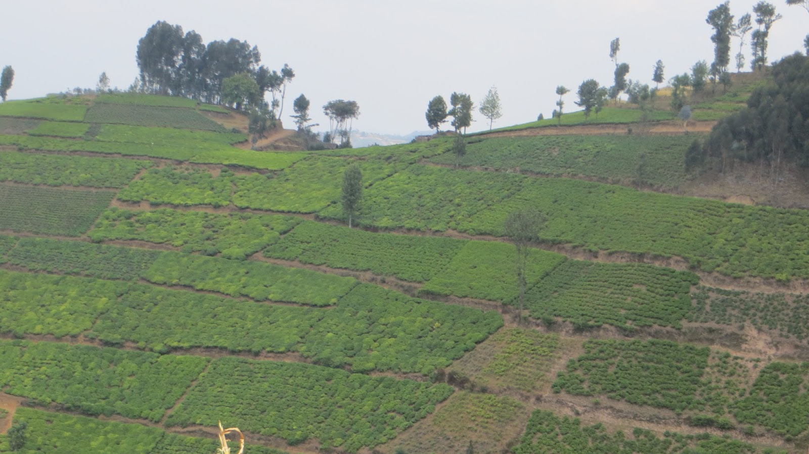 | Stopping to view the valley, the patches of farms and houses. It was so hazy when Eva and Mathias were here in Rwanda. In fact, one of the longest stretches of cloudy, hazy weather that we have seen. |